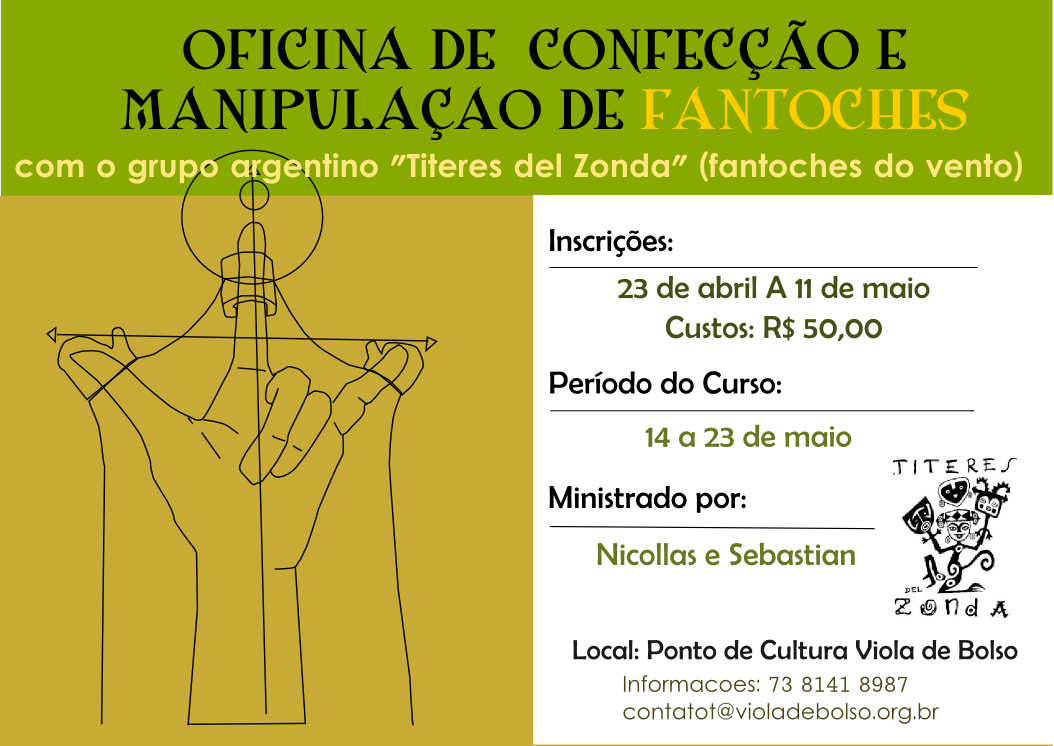Estão abertas as inscrições para a Oficina de Fantoches, que será sempre à noite as 19:00h, no Espaço Cultural do Viola de Bolso.