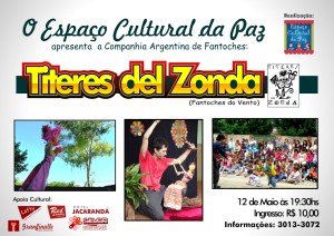 O Ponto de Cultura do Viola de Bolso está recebendo entre os dias 10 a 24 de maio em Eunápolis, a Companhia TITERES DEL ZONDA(Fantoches do Vento), de Buenos Aires, na Argentina. O grupo atua com teatro de fantoches na capital, realizando oficinas e apresentações para diversos públicos. O intercambio cultural com o Viola de Bolso se insere na programação dos projetos de Pontos de Cultura entre Brasil e Argentina, movimento continental em defesa da cultura popular e comunitária, representada no Brasil pelo Programa Cultura Viva e na Argentina pela Plataforma Puente.