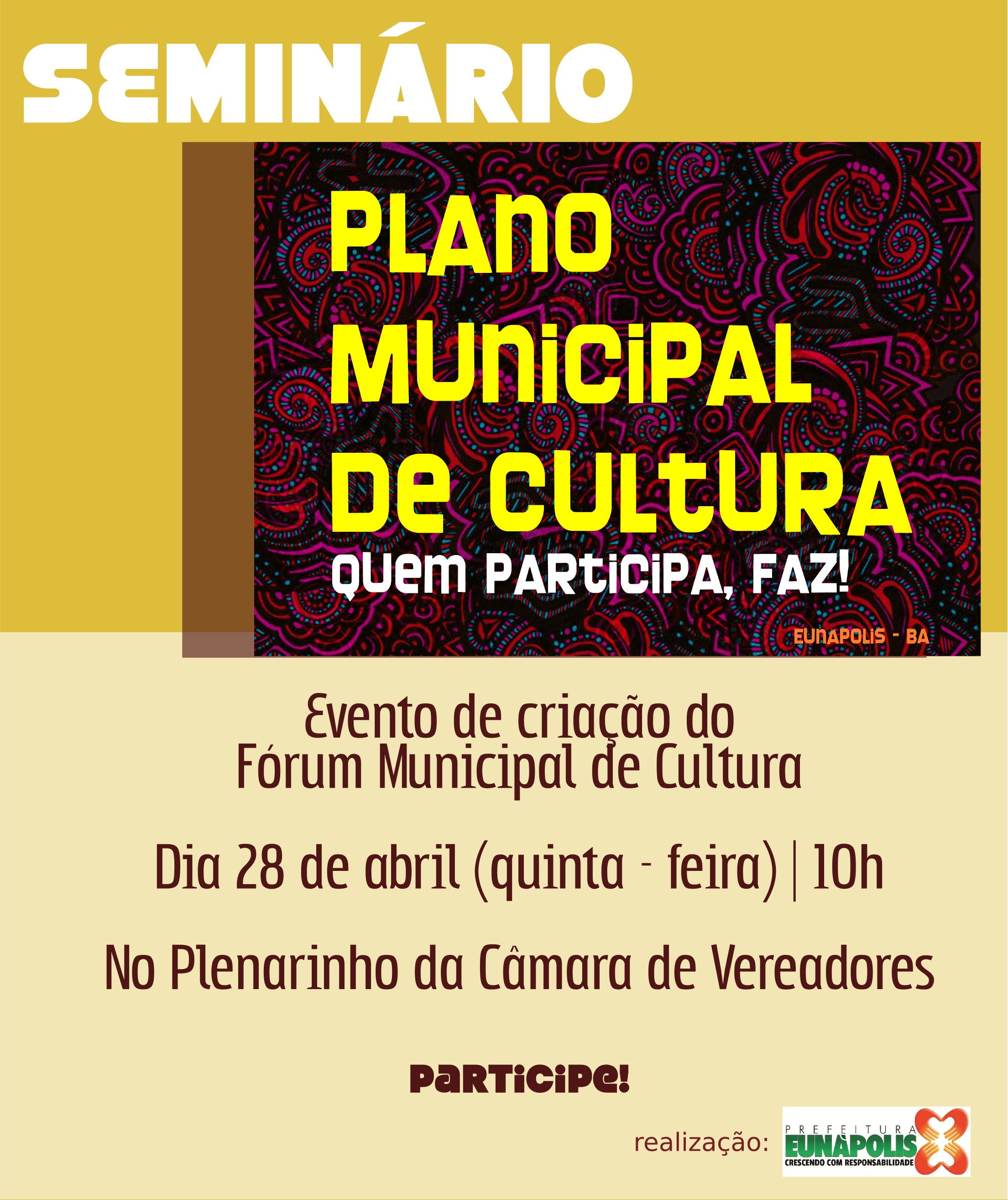 A cidade de Eunápolis, no Território Costa do Descobrimento, ganhará seu primeiro Fórum Municipal de Cultura a partir da próxima quinta-feira, 28. O marco de lançamento será o seminário “Plano Municipal de Cultura, quem participa faz”, evento que será realizado no Plenarinho da Câmara de Vereadores, às 10 horas.