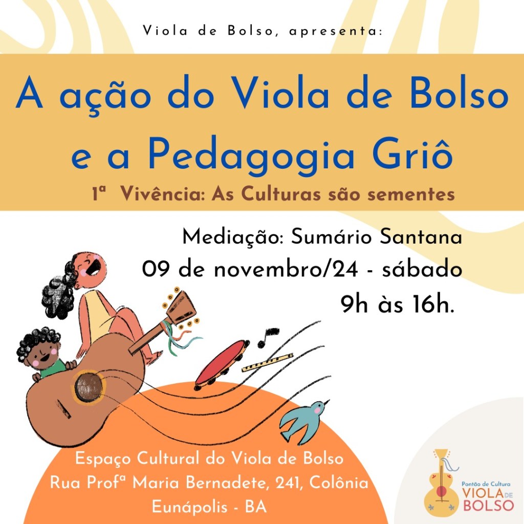 A gente começa dia 09 de novembro/24, sábado, das 9h às 16h, no Espaço Cultural do Viola de Bolso, Rua Profª Maria Bernadete, 241, Colônia Eunápolis.